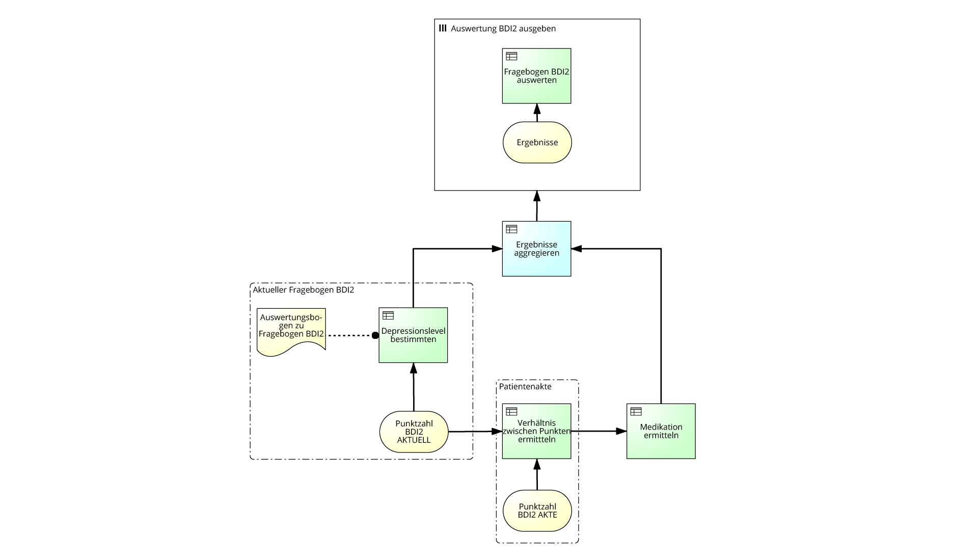 Der Prozess, ein reales Szenario aus der Psychotherapie Osthessen, zeigt die Behandlung eines Patienten, der sich bereits seit einiger Zeit dort in Therapie befindet. Die Entscheidung darüber, ob die Medikation verändert oder beibehalten wird, speist sich dabei aus verschiedenen Unter-Entscheidungen. Dazu gehört der Grad der Depression, der wiederum von der Auswertung eines Patientenfragebogens abhängt. Wie wird der Punktestand aus der Befragung korrekt ermittelt? Wie wird der ermittelte Punktestand korrekt mit bereits vorhandenen Werten aus der Patientenakte verglichen? Wie bestimme ich den Grad der Depression?