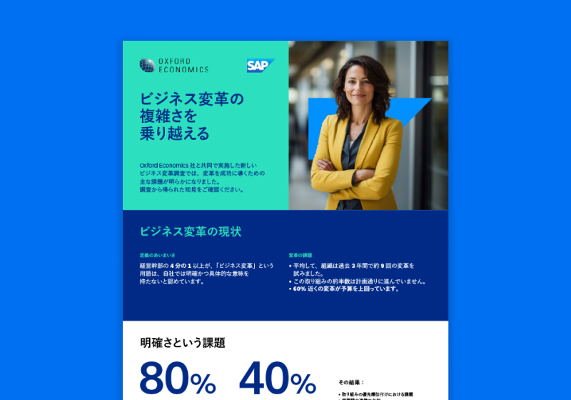 SAP と Oxford Economic 社は、世界の経営幹部 800 人を対象に共同調査を行いました。この調査では、彼らが目標と成果の決定的な差異をどのように考えているかを明らかにし、望ましい未来の状態の実現に向けて人、プロセス、アプリケーション、データを連動させる方法を浮き彫りにしています。